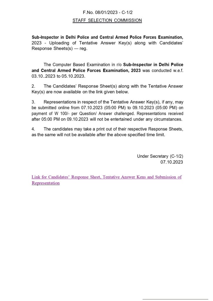 - Find the Notification Section: Check the most recent announcements for the notification called “Answer Key for CAPF CPO SI Paper I 2023“.